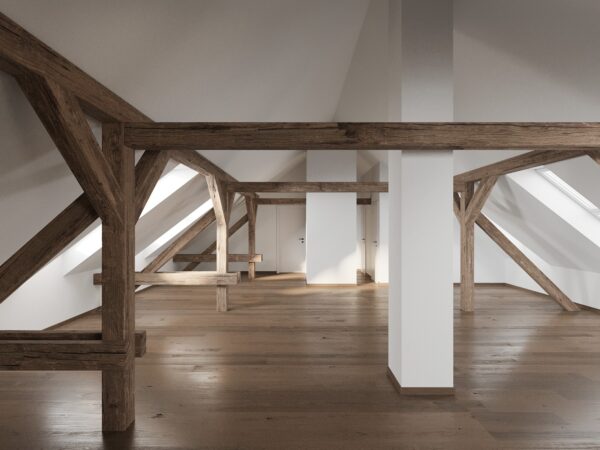 Interiér C (Podkrovie): 123,10 m² – Vzdušný priestor pod historickým krovom, kde sa spája tradícia s modernou otvorenou dispozíciou.